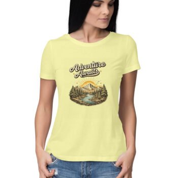 Adventure Awaits Women Graphic T-Shirt – Minimal Vintage Nature Printed Tee | Stylish Half Sleeve Round Neck T-Shirt for Women | SkyingGlitty