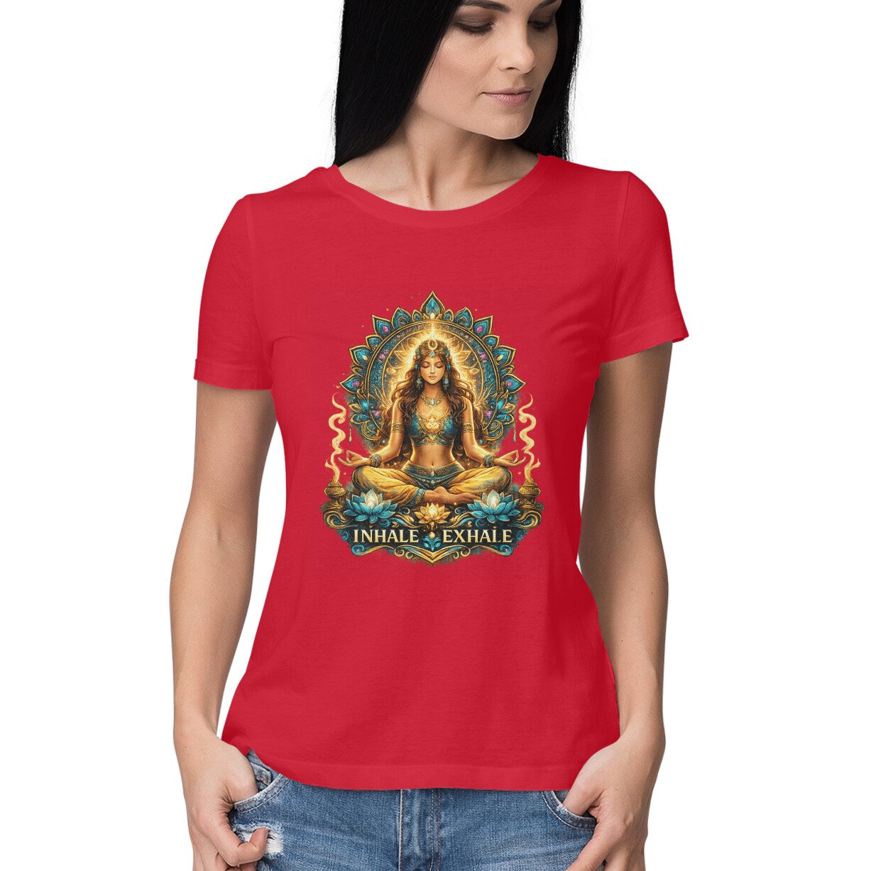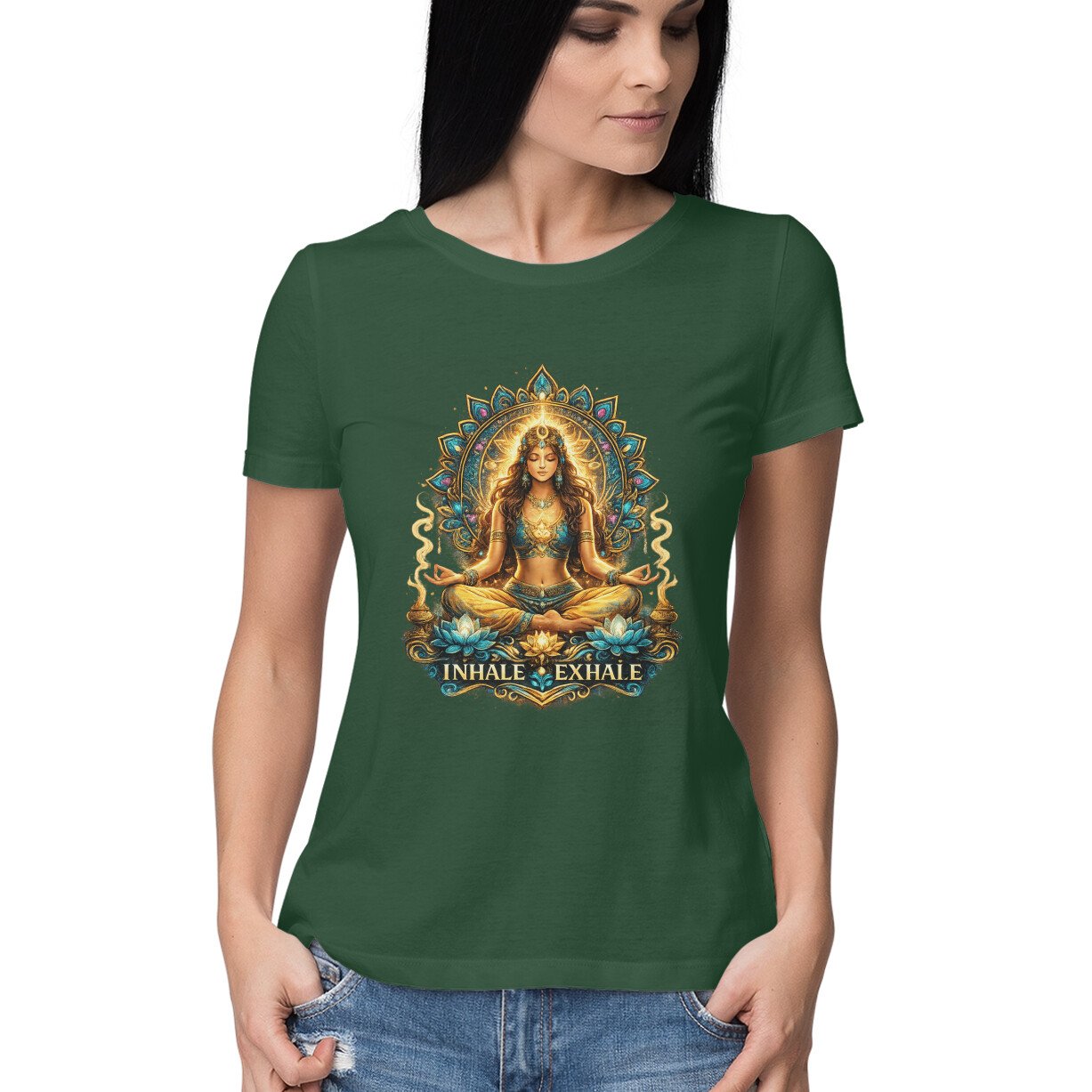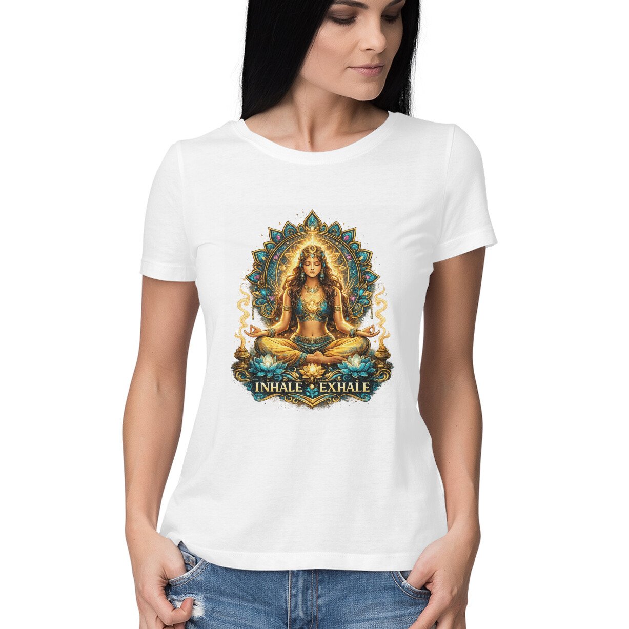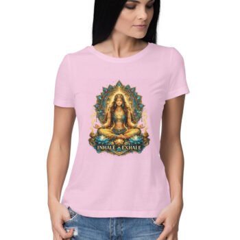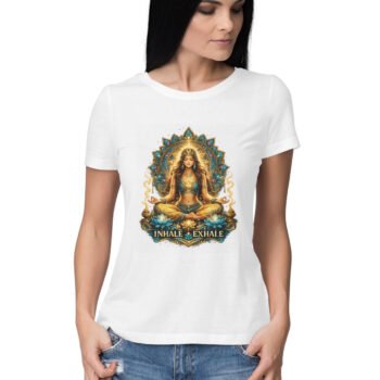 Find your inner peace with this elegant “Inhale Exhale” yoga graphic t-shirt. Featuring a serene meditative pose with a detailed mandala design, it’s perfect for women who love mindfulness, yoga, and spiritual aesthetics.