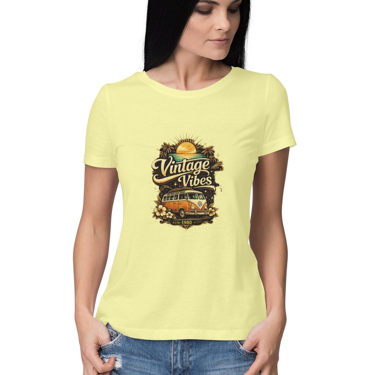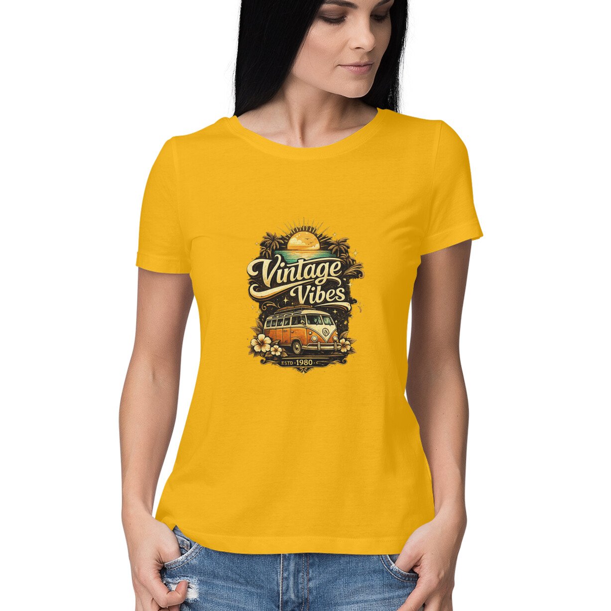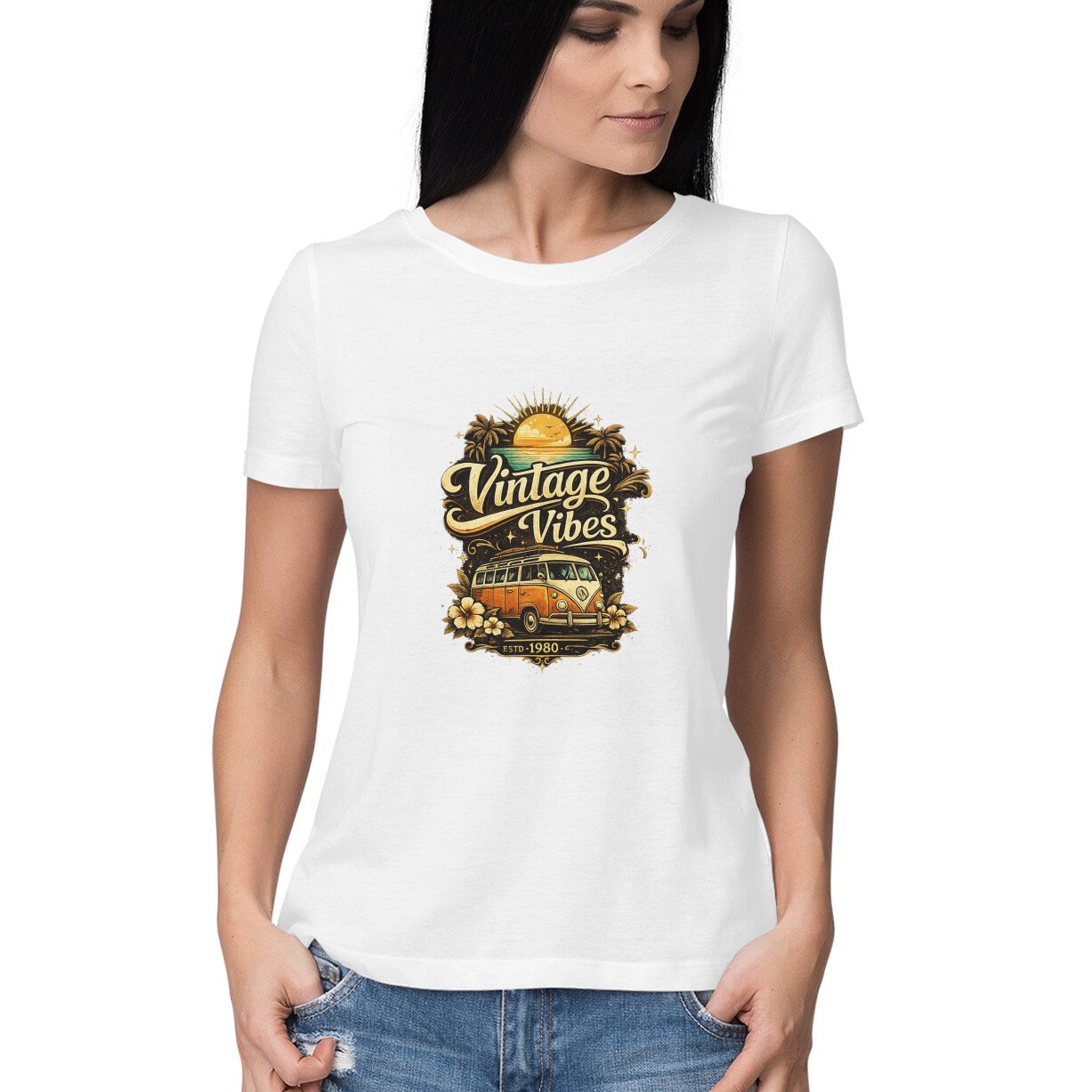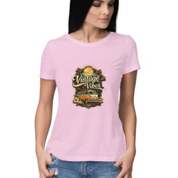 Step into retro style with this “Vintage Vibes” graphic t-shirt. Designed with nostalgic elements and warm vintage tones, it’s perfect for women who love classic fashion with a modern twist.